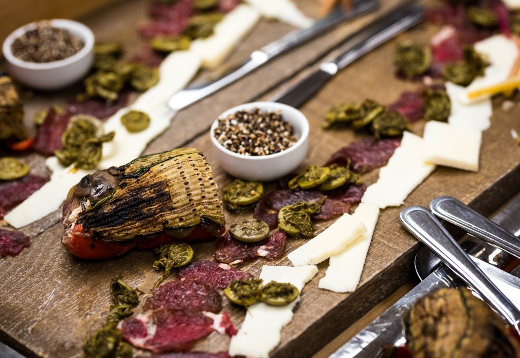 Charcuterie boards with both meat and vegetarian options (cured meat, fresh vegetables, hummus, pickles, bannock), GF options available, served family style