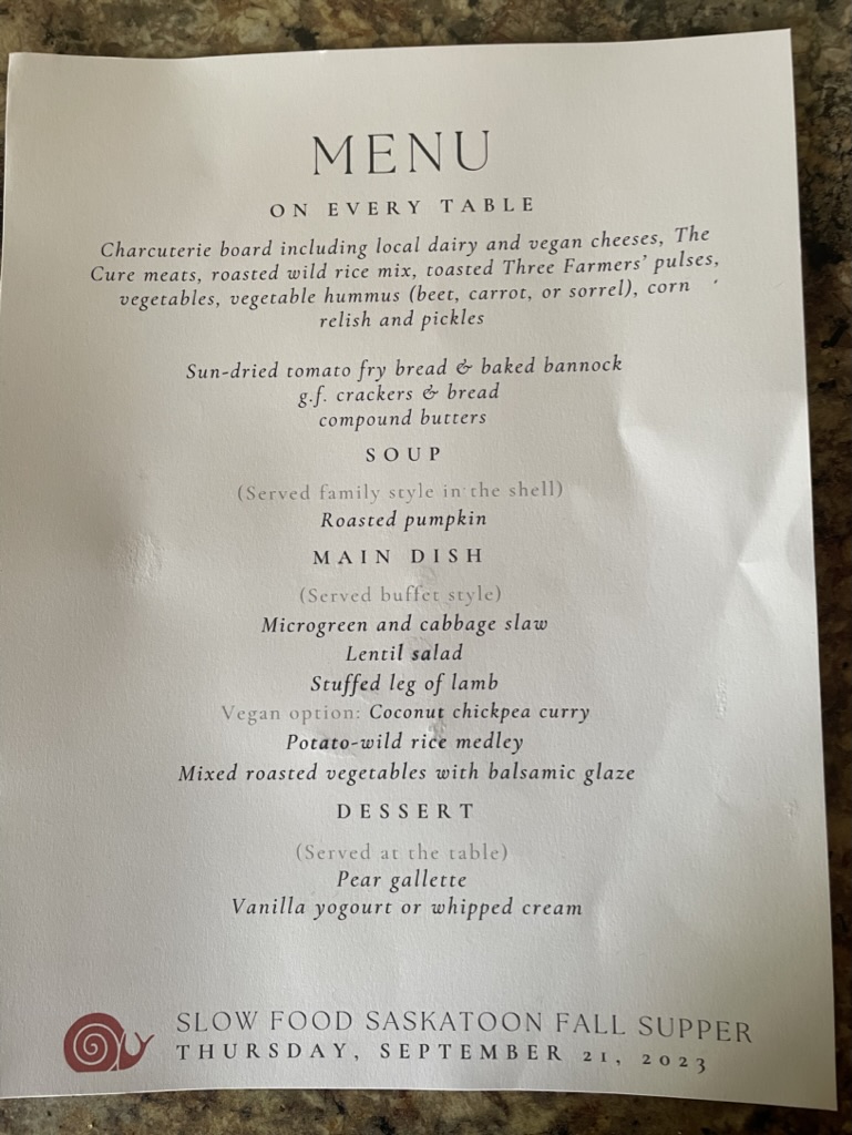 Slow Food Saskatoon/Saskatchewan is delighted to announce the reinstatement of our Fall Supper fundraiser. It will take place on September 21st, 2023, in collaboration with the 2023 Nourish Food for Health Symposium, which will be happening in Saskatoon on September 20th and 21st. The symposium, which explores how health professionals and leaders are reimagining food in health care to improve health equity, climate action, and patient healing, is supported by CHEP Good Food and shares many values with the Slow Food movement.