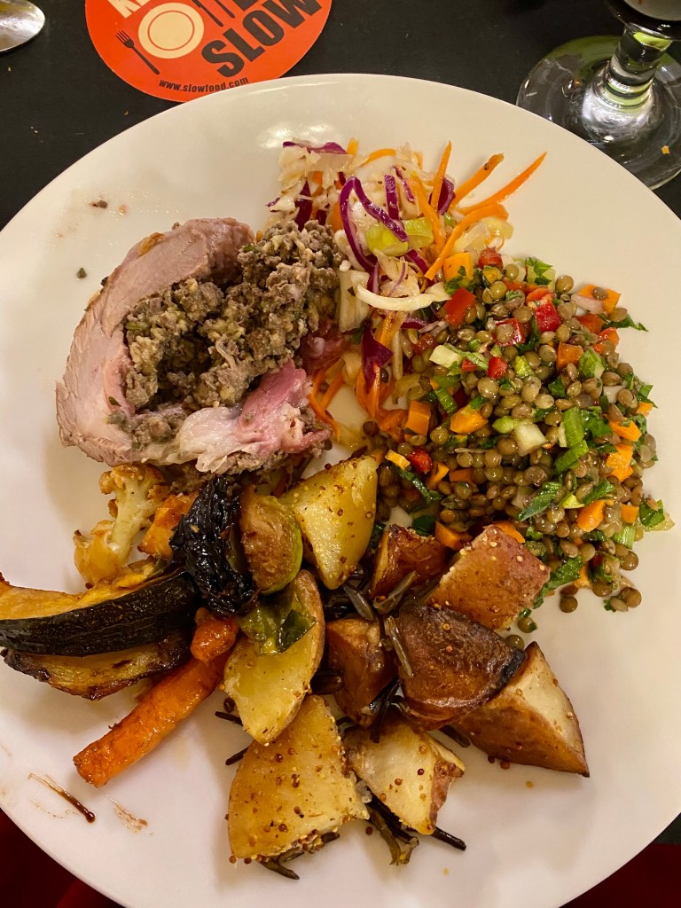 The main course was served buffet-style and included a fresh coleslaw and vegan chickpea curry by Felicia Fox, French lentil salad by Fresh Dish Catering, a Roasted Potato and Wild Rice Medley and Balsamic Roasted Mixed Vegetables by chef Michael Beaulé and the pièce de résistance, a stuffed, rolled leg of lamb by Chef Evelyn.